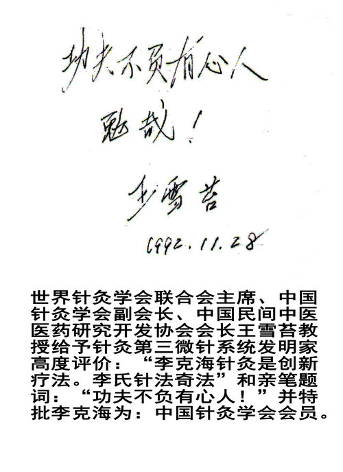 1992年11月28日,李克海带长篇论文到北京世界卫生组织,请世界针灸学会联合会主席王雪苔教授审阅,王老给予高度评价“李克海针灸是创新疗法”和亲笔题词:“功夫不负有心人!”(《中国中医药报》报道),中国针灸学会理事、河北省针灸学会第一副会长高玉椿教授高度评价:“李克海针灸是新发明。”、中国针灸专家讲师团秘书长、《针灸学报》总编辑编审李复峰教授高度评价:“李克海的新针疗法是当今世界针灸研究的方向,与日本的、美国的、台湾的针灸理论并论有自己的特色,我支持。”共同扶持这一新生事物,并列入邯郸地区一九九二年科研计划项目(攻关部分)课题编号:9221718,课题负责人李克海,文件在《课题名称及简要说明中说:“中指‘三节一体’对应取穴取穴诊疗法是新的发明,引起了国内针灸界的高度重视,解决的问题有二,一是从理论上对奇经八脉有新的认识对经外奇穴有新解释;二在临床上,为针灸这一宝库增加了一种新的生物全息诊疗法。”并补充了《生物全息诊疗法》的“头目不分”“阴阳不分”的不足。