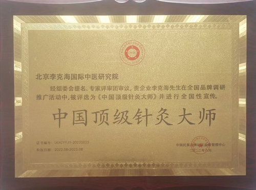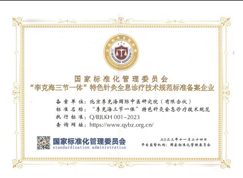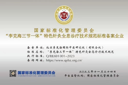 2023年,国家标准化管理委员会授予“李克海三节一体”特色针灸全息诊疗技术规范标准备案企业,备案单位:北京李克海国际中医研究院(有限合伙),标准名称:“李克海三节一体”特色针灸全息诊疗技术规范,执行标准:Q/B亅LKH001——2023。