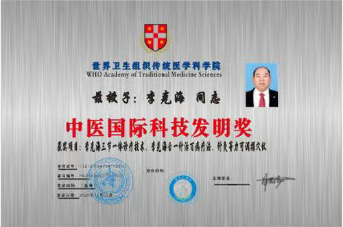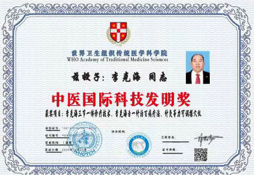 2025年3月5日世界卫生组织传统医学科学院,授予:李克海同志中医国际科技发明奖,获奖项目:李克海三节一体诊疗技术、李克海舌一针治百病疗法、针灸等力可调探穴仪。