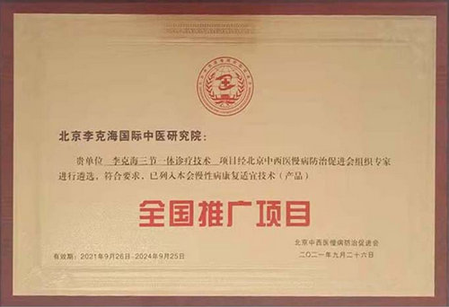 2021年9月26日,在北京国医大师李佃贵教授为首的和同中国中医科学院、国家科技部中国生物技术发展中心、空军特色医疗中心等单位组成专家组通过遴选会、论证会和李克海答辩,北京李克海国际中医研究院:贵单位李克海三节一体诊疗技术……列入全国推广项目。中央电视台多家主流媒体发布报道。
