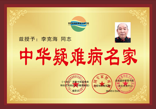 2023年12月1日,《“十四五”国家中医疑难病特效疗法拔尖人才》编委会等单位联合多家中央主流媒体共同举办“中华疑难病名家”评选活动,李克海被评选为“中华疑难病名家”又与张伯礼、仝小林、李佃贵、唐祖宣、石学敏等“中华疑难病名家”荣誉称号齐名。