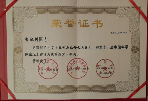 先后获《联合国科教文组织亚洲专家秘书局贺电》,获《国杰研究院钱学森教育思想研究会贺电》;获深圳市宝安区组织部、宝安区科技局、宝安区科学技术协会颁发的《哥德巴赫猜想1+1论文三等奖》证书;荣获2014年中国未来研究会、中国高科技产业化研究会、未来杂志社联合颁发的《中国科技创新最佳发明成果奖》证书;《达科格位数论代数运算系统》文章入编在中国首部《走向世界的共和国精英》文献,荣获《辉煌中国·时代精英》优秀论文奖证书与牌匾。先后获CCTV成功之路栏目等单位颁发的《时代楷模爱心中国达科格位数论体系杰出科学家》证书与牌匾、《时代楷模爱心中国数学基础理论体系杰出科学家》证书与牌匾。先后获《影响中国的学者》、《走向世界的共和国精英》、《推动中国的领军人物》、《深圳市书香家庭》、《深圳市宝安区家德家风故事百篇》等殊荣称号;中国伏羲文化研究会会员,中国天水伏羲文化研究会会员,中国淮阳伏羲文化研究会会员,珠江文化战略研究会副会长,深圳市侨缘协会顾问。