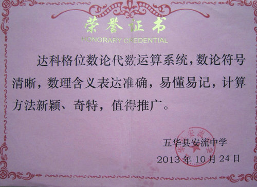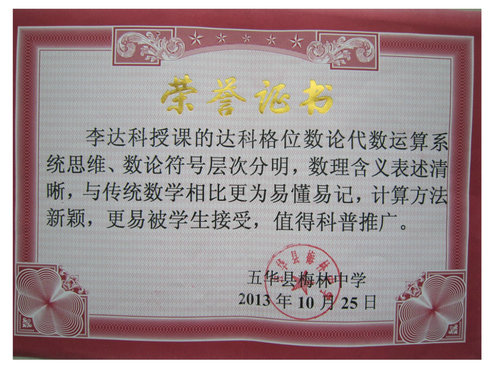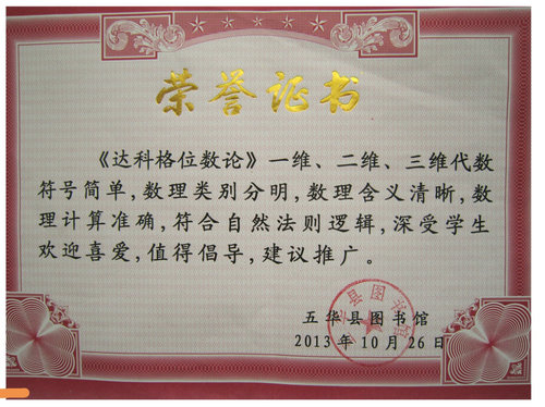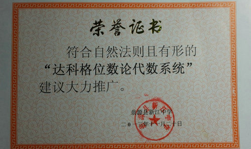 北方工业大学控制系博士生导师李小坚也有《浅析达科格位数论》为证:“数学是抽象思维的工具,也是描述现实世界关系的基本方法。毕达哥斯拉的“万物皆数”思想将物与数等同,但事实上物与数是不同的。物是占据物理空间的自然客观事物,数是抽象空间的数量关系。物与数既是分离的,又是关联的。西方科学的发展,越来越抽象与任性。西方数学广泛采用点集数学,导致产生了离散与连续的矛盾。因此,希尔伯特把康托的连续统问题列为二十一个重大问题之首。这就造成了越来越抽象的数学研究,最后还是避免不了数学系统的相容性、完备性、一致性等问题。东方人对物质的认识更为客观,中国古代采用直尺圆规丈量物质,规范物质,故有“无规矩不成方圆”之名言。将“数”的大小看作尺规所至,具体地体现了物理空间结构与客观世界数理结构关系。这种线段数学的引入,避免了西方连续统的矛盾出现。结构主义研究数学对象的属性关系作为某种数学结构表达。如果这种数学结构具有某种性质,则同类结构的客观事物也具有这种性质。这样的数理结构化研究在更大范围与更高层次上体现事物之间的客观与抽象的对应关系。达科格位数论开创了基于客观世界的点、线、面、体特征数系,建立了非立体属性零点格位的内点结构、线段格位代数数理结构、平面格位代数数理结构、立体格位代数数理结构三层数系,并分别形成“三维一点与二维一点及一维一点”的数系之间的数理结构体系。这是对古典线段数学的升华与创新,从而自成体系且更完美。达科格位数论基于线、面、体三层数系,数系之间的关系是客观明确的,既是代数方程约束的关系,又是自然逻辑法则的判定的关系。达科格位数论独创的数理符号系统具有明显创新特色,便于符号运算并解释其内在逻辑关系。大量逻辑推理演绎,表明数系之间数理逻辑关系自洽融合。因此,达科格位数论具备多体系交叉代数结构,反映了各数系层次关联与动态序结构,体现了客观实体物理空间拓扑结构,具有拓展与完善布尔巴基学派数学结构化特征。达科格位数论研究的这种结构性质相对稳定、具体客观、清晰明确。因此,所有的公理,不证自明,自证清明。逻辑自然而然,符合数理。结论简洁明了,易于检验。达科格位数论既是具体格位对象的抽象数学的理论研究,又是空间实体结构的具象的关系探索。从线、面、体三层数系体现天、地、人对应的宇宙万物相互关联的抽象与具象概念,很好地解释了周易数理,获得对易学理论的独具慧眼的阐述,给出了古代中华文明数理逻辑与辩证逻辑的现代表达,兼具数学与哲学思维的融汇贯通。达科格位数论同时也是数与形的精巧表达艺术,从不同的侧面直观体现了达科格位数论的数形之美。达科格位数论还可具体应用于通信与密码体系,为国防和安全保密提供新颖奇特的富有创造力的基础数学工具。达科格位数论把几何直觉形象对象转化为多数系的格位代数对象的研究方法,总结了自然世界万物层次结构特性的客观规律,打开了一个探索自然数理逻辑的新思路,开辟了一条结构化数学研究新通道,拓展了客观实在与形式化数理研究与应用的新天地。达科格位数论值得研究、值得鼓励、值得赞赏、值得发扬光大。达科格位数论体现中国智慧,助力中华民族复兴,光耀世界,造福人类!