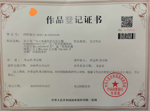 李达科老师经18年的历练磨难,提炼描绘了“三维的物体在二维的平面作一维的线性运动”的格位数论文句及其对应的“‘一维线性平方根(即长度)线段实数’乘以‘二维平方面积实数’等于‘三维立方体积实数’”的代数方程体系。李达科老师站在传统数学巨人的肩膀上,以十个世人耳熟能详的数字符号体系和计算工具符号体系为依据,避开数学先辈的荆棘道路独辟蹊径,既寻找到了一维非线性的o与一维线性的a,d,p,y,ý,ÿ,ñ,î,及其进位组合的ao,aa,ad,ai,ap,ay,…的代数符号体系;也寻找到了二维非平面的O与二维平面的A,B,C,D,E,