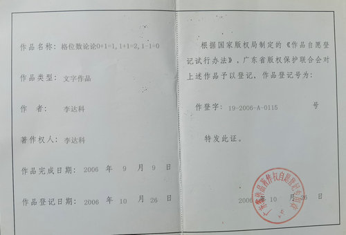 无疑地说,李达科老师这0与1的深邃数理哲学解读,既揭示了0与1的最底层逻辑,也揭示了0与1的数理哲学的最高境界。因为“一维线性平方根(即长度)线段实数乘以二维平方面积实数等于三维立方体积实数”的体积定理,既超越了传统数学的体积等于长度乘以宽度再乘以高度的V=abc猜想方程,也超越了爱因斯坦的E=Mc²质能方程。李达科老师告诉我们:这0与1及其一维线性线、二维平面、三维立体各数理层次的“‘1+1求和’同步于‘1×1求积’为数学元素砌筑起来的数学大厦是牢不可破和永不坍塌的。李达科老师的格位数论,不但是点线面体的数学基础理论体系,而且就是古老的“伏羲阴阳八卦六爻无极太极的东方哲学数理”。至目前为止,李达科老师用发现数理哲学奥秘的慧眼,发明了“新颖奇特、直观有形具象、符合自然、逻辑严谨、数理层次分明、平方根实数与正方形平方面积实数数学源流清晰、立方根实数与正方体立方体积实数数学源流清晰”的一维数域与二维数域及三维数域的代数符号体系及代数方程体系,不但完全吻合对应数字符号体系及数字数字体系,而且吻合对应立体与平面及线性正、负向量坐标体系,吻合对应乘法口诀体系,吻合对应除法口诀体系,吻合立体平面线性图形图像体系,吻合人类仿生科学产品体系。难怪乎甘肃省天水一中;广东省安流中学、华阳中学、梅林中学、棉洋中学、五福中学的师生们都说“达科格位数论,代数符号数理层次分明,易懂易记,建议大力推广”。难怪乎华南师范大学广东省人工智能机器人产业学院院长朱定局教授于2024年7月25日写下了“格位数论一人创,以达科学之根基;格数论道非常美,道法自然源伏羲;一维二维生三维,天地万物皆归位;一维线性oad,二维面积OAB,三维(O,A,B)下标立方体,点线面体都具备,加减乘除运算对;线线成面面线体,数形可见真神奇;数论能算天下事,遍及各行兴经济。”的美诗。