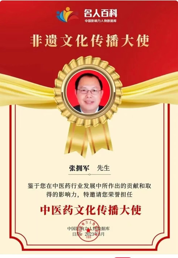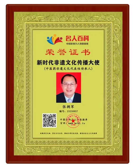 2013年他荣登《名人百科》,荣获“新时代非遗文化传播大使〞(中医药非遗文化代表性传承人)。